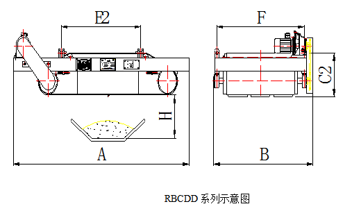 1.該系列除鐵器是在RBCDB系列除鐵器的基礎上,配上機架滾筒和帶刮板的卸鐵皮帶等組成的一種自動卸鐵的帶式除鐵器。即在保證磁場性能(主要參數安匝數IN)不變的情況下,增加線圈匝數N,降低電流密度I,從而大幅度降低了除鐵器線圈發熱量,將除鐵器的溫升控制在70℃之內,延長除鐵器的使用壽命,節能降耗。