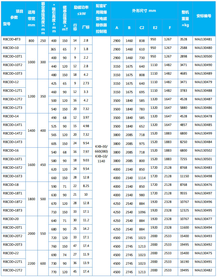 四、RBCDD系列隔爆型懸掛電磁除鐵器主要技術參數、外形尺寸 執行標準:GB3836-2010、Q/321191ACL003